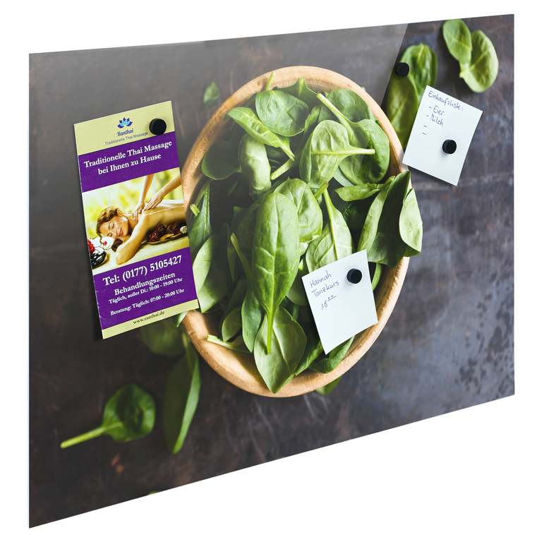 - 3. Magnetwand: Durch das zusätzliche Anbringen eines Metallrückens hinter den Druck wird somit die gesamte Fläche zu einer Magnetwand. Bitte beachten Sie, dass Sie besonders starke Neodym-Magnete benötigen. Im Lieferumfang werden bereits 2 Neodym-Magnete gratis mitgeliefert.