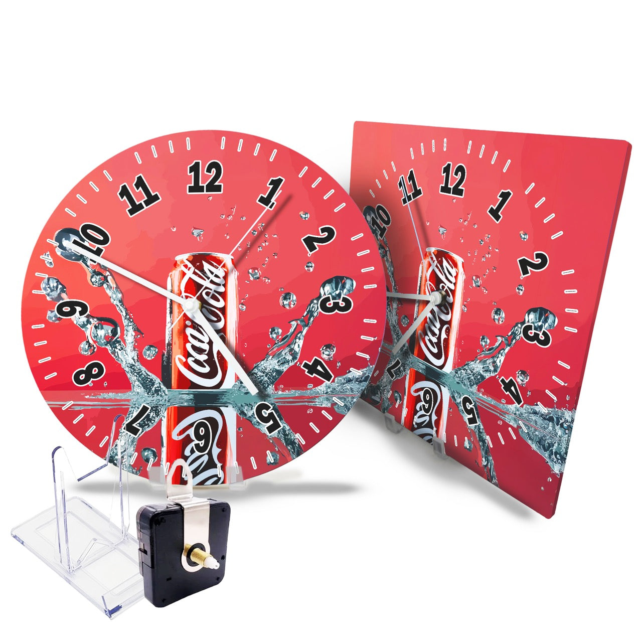 Die Wanduhren verfügen über eine Aufhängung direkt am Uhrwerk. Dies ermöglicht eine einfache und stabile Anbringung an der Wand. Außerdem liegt der Uhr ein transparenter Acryl-Ständer bei, mit denen die Uhren auf einer Komode oder im Regal einfach aufgestellt werden können.