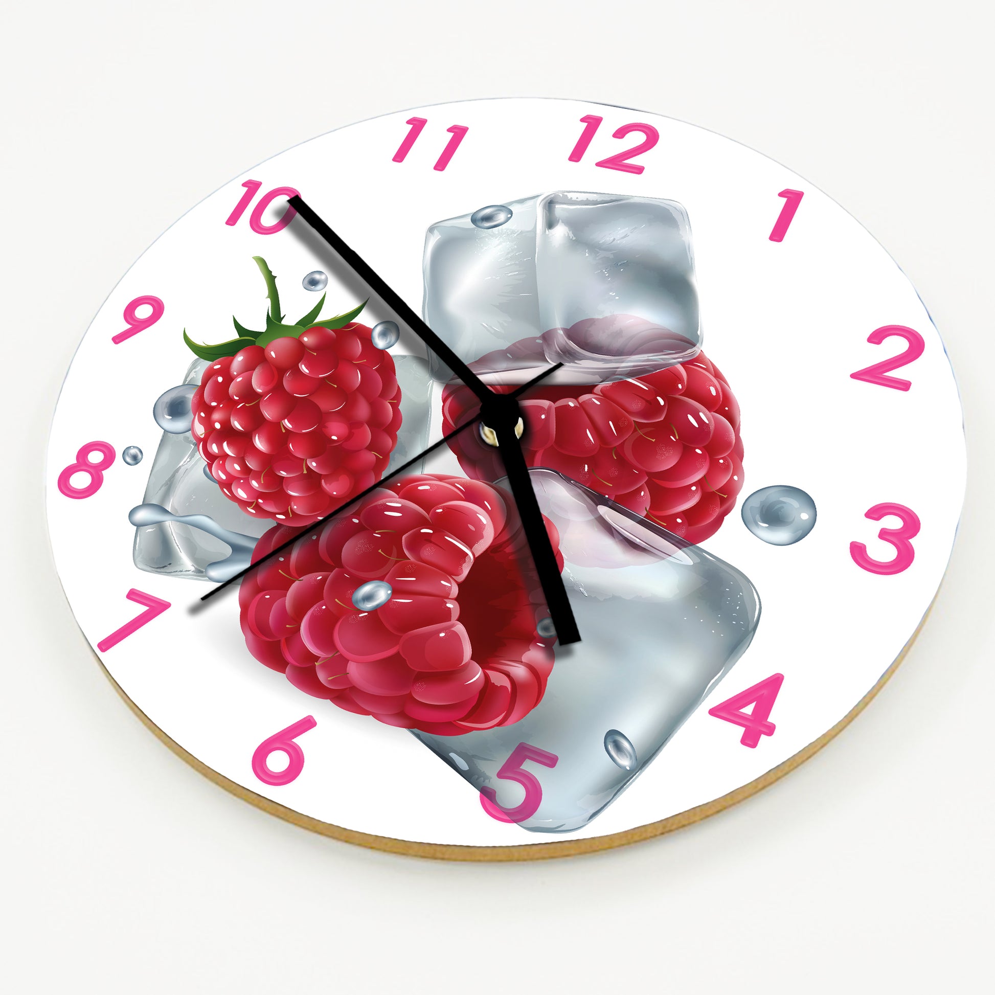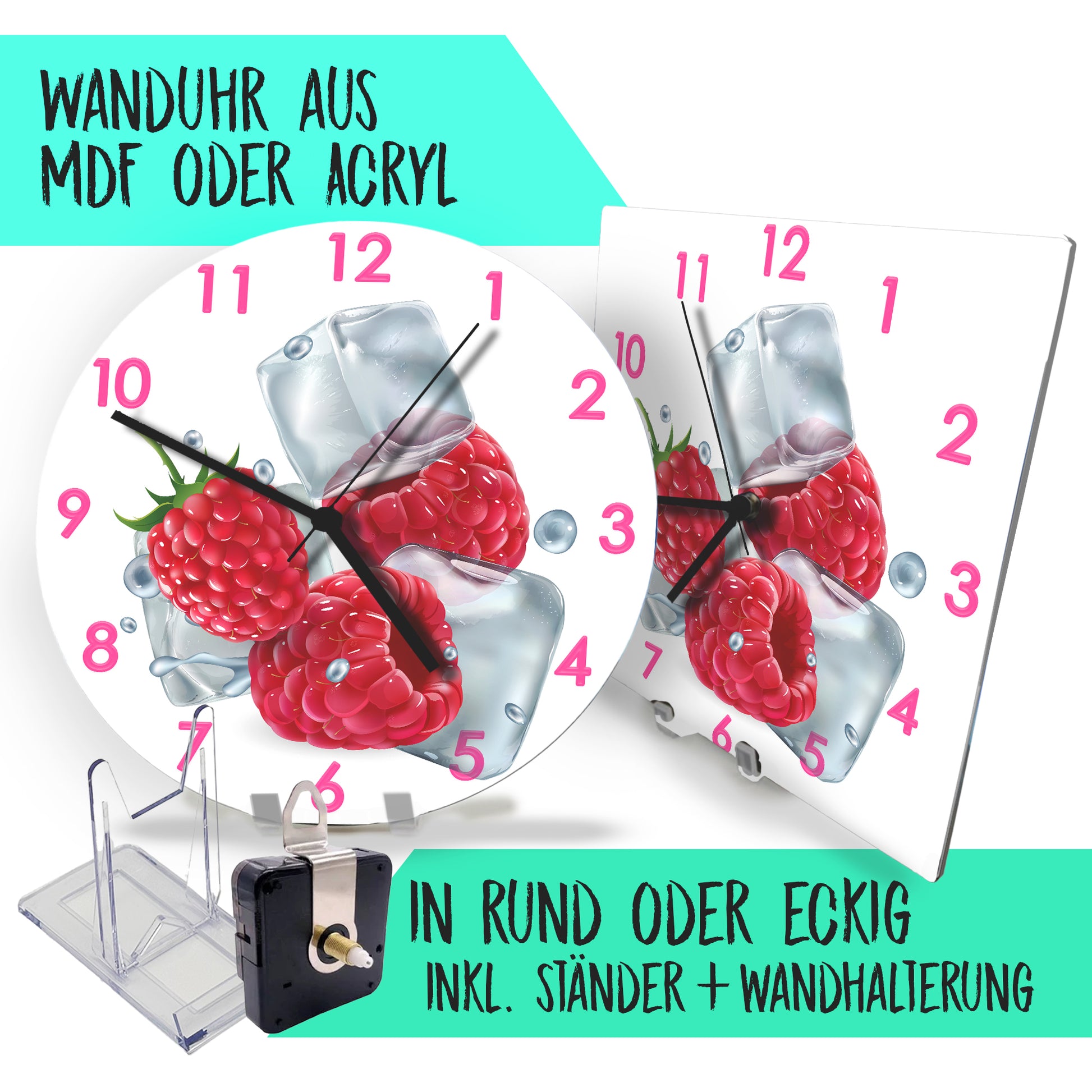 Hochwertige 30cm-Uhren Made in Alzenau Lautlose Uhr MDF Acryl Motiv Himbeere auf Eis