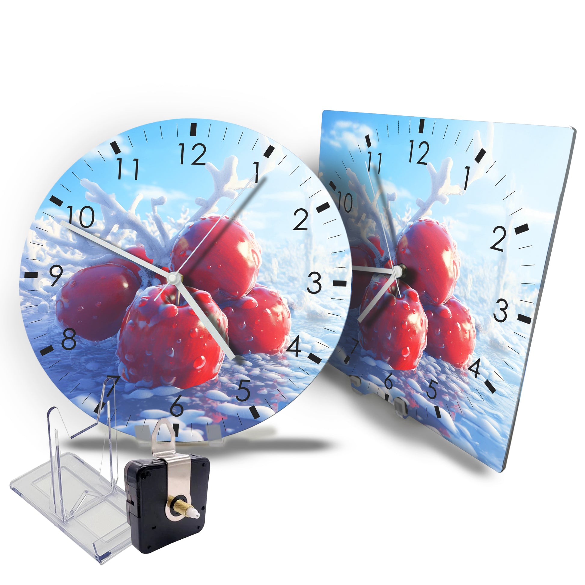 Die Wanduhren verfügen über eine Aufhängung direkt am Uhrwerk. Dies ermöglicht eine einfache und stabile Anbringung an der Wand. Außerdem liegt der Uhr ein transparenter Acryl-Ständer bei, mit denen die Uhren auf einer Komode oder im Regal einfach aufgestellt werden können.