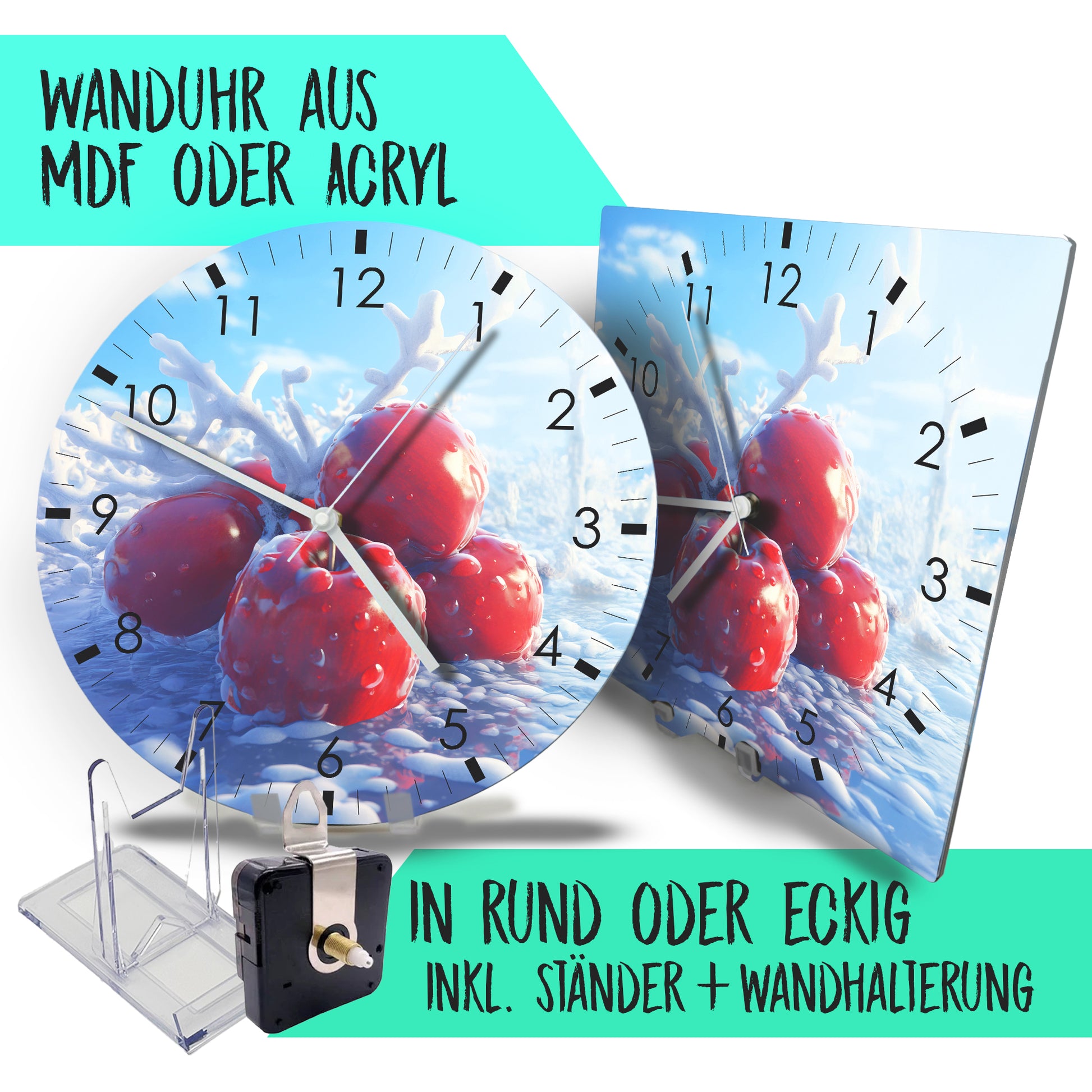 Unsere Wanduhren haben einen Durchmesser bzw. eine Kantenlänge von ca. 30 cm und sind aktuell in folgenden Formen verfügbar: